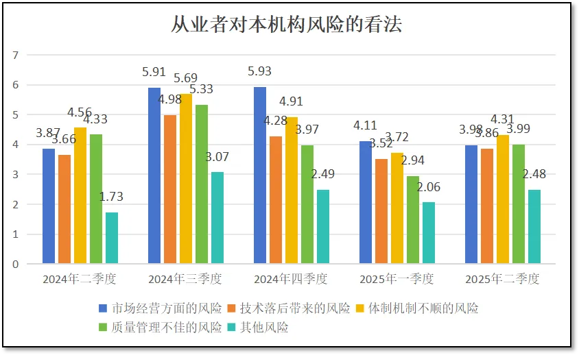 对“技术能力”、“体制机制”、“质量管理”以及“其他”等几个风险事项来说,2025年二季度的分值分别为3.86、4.31、3.99和2.48分,均较上一季度提升不小,说明二季度以来尽管业务逐步恢复,但以前留存的问题依然留存,并逐步显现出对今后发展的影响,业界对这几方面风险的担忧顾虑开始反弹。