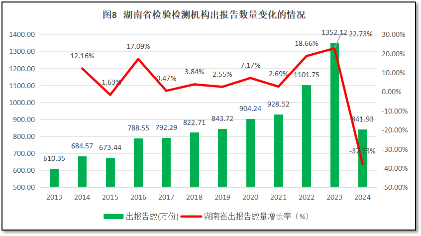 从图8来看,在2023年之前,湖南省检验检测机构对外出具的检验检测报告数量逐年增长,到2023年达到1352.12万份,是历年来的最高值。2024年,湖南省检验检测机构出具的报告数量出现断崖式下降,仅有841.93万份,净减少约510.2万份,是最近五年来的最低值。从增长率曲线来看,2023年之前湖南省检验检测机构出具报告数量的年均增幅为8.57%,年度最高增幅出现在2023年,达到22.73%的增幅,但2024年出现了-37.73%的降幅,如不考虑可能存在的数据误差,也说明湖南省检验检测行业正在快速收缩,业务量下降速度很快。