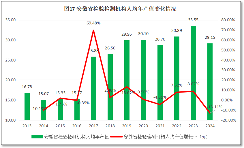 由图17可见,2016年之前,安徽省检验检测机构人均年产值增长率较低,在2017年出现一次69.4%的巨大增幅后,人均年产值从15万元左右快速增长到25万元左右,此后增速放缓,部分年份还出现负增长。2023年,安徽省检验检测机构人均年产值一度达到33.55万元的峰值,但2024年出现较大回落,仅有29.15万元,同比增幅为-13.11%,是历年下降程度最大的一次。