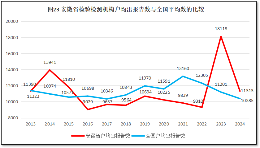 2024年度,安徽省检验检测机构户均出具检验检测报告11313份,与全国平均水平10385份十分接近,全国排名第5位,较2023年度排名下降1位。从2013年以来,安徽省检验检测机构户均出具检验检测报告数量与全国的比较如图23所示。
