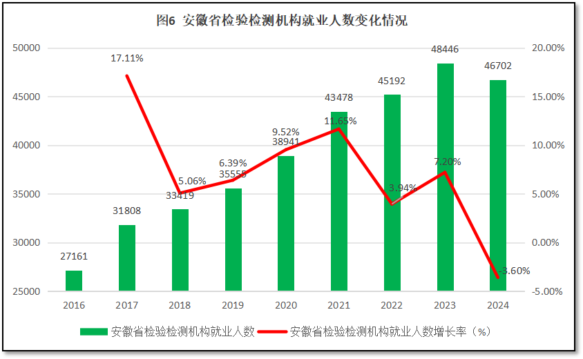 由图6可见,从2016年到2023年,安徽省检验检测机构就业人口数量保持增长,从2016年的2.71万人增长到2023年的4.84万人。但是,受到机构数量下降等因素影响,2024年末安徽省检验检测机构就业人口数量下降为4.67万人,较2023年度净减少约1700人。从增长率曲线看,安徽省检验检测机构就业人数增长率曲线呈现W型的变化特点,在2017年出现17.11%的高增幅,之后在2018年跌至5.06%。此后增长率又慢慢提升到2021年的11.65%,到2022年下降为3.94%,2023年的增长率反弹到7.2%,但2024年又下降到-3.6%。2024年也是安徽省检验检测机构就业人数首次出现净减少的一年。